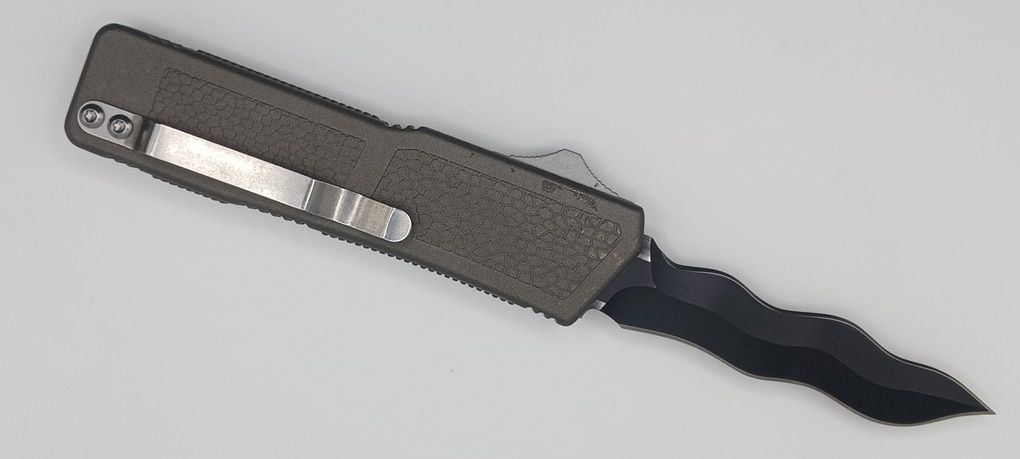 Lightning Supreme Gray D/A OTF Automatic Knife Kris Point Black Plain. The Gray Lightning Supreme has an 8 inch total length with a 3.25 inch blade. It is a double action in and out switchblade knife. This is a taiwan version. The taiwan version was the first produced before the chinese versions came out. This version has aircraft aluminum handles and better made metal blades. The springs in these are made better than the chinese versions. It comes with a pocket clip which can be taken off.