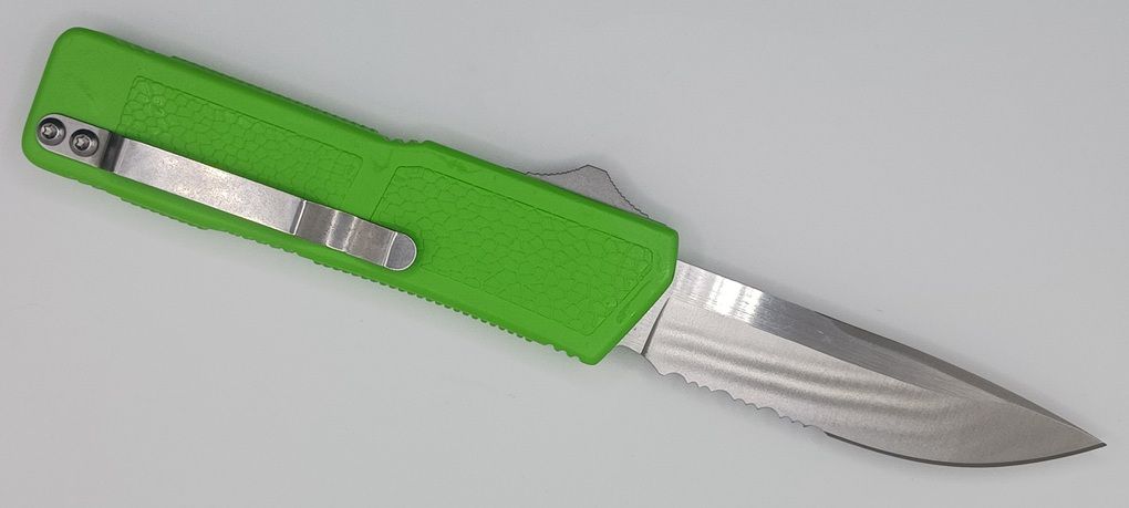 Lightning Supreme Green D/A OTF Automatic Knife Drop Point Satin Serrated. The Green Lightning Supreme has an 8 inch total length with a 3.25 inch blade. It is a double action in and out switchblade knife. This is a taiwan version. The taiwan version was the first produced before the chinese versions came out. This version has aircraft aluminum handles and better made metal blades. The springs in these are made better than the chinese versions. It comes with a pocket clip which can be taken off.