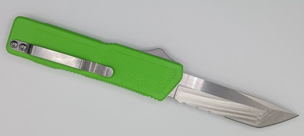 Lightning Supreme Green D/A OTF Automatic Knife Tanto Point Satin Serrated. The Green Lightning Supreme has an 8 inch total length with a 3.25 inch blade. It is a double action in and out switchblade knife. This is a taiwan version. The taiwan version was the first produced before the chinese versions came out. This version has aircraft aluminum handles and better made metal blades. The springs in these are made better than the chinese versions. It comes with a pocket clip which can be taken off.
