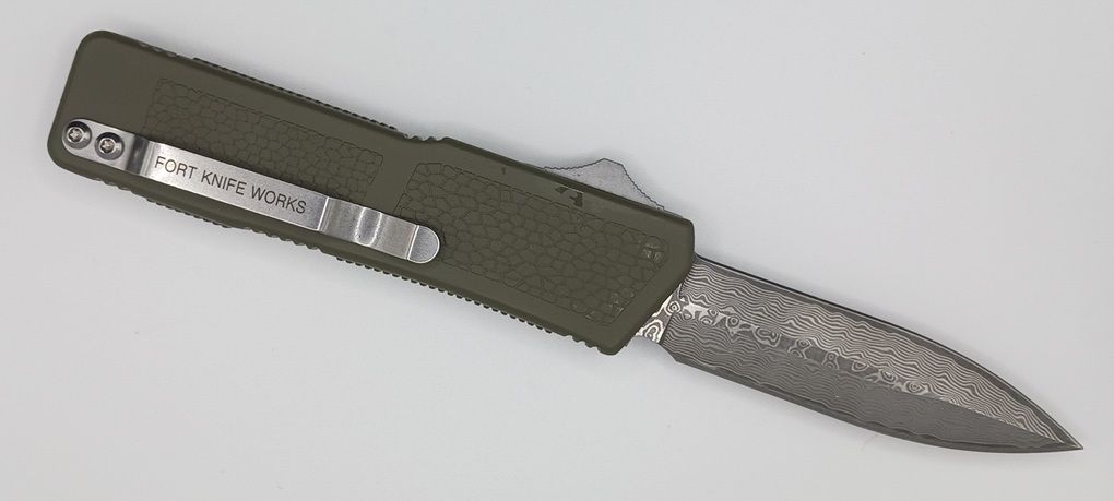 Lightning Supreme OD Green D/A OTF Automatic Knife Dagger Point Damascus Plain. The OD Green Lightning Supreme has an 8 inch total length with a 3.25 inch blade. It is a double action in and out switchblade knife. This is a taiwan version. The taiwan version was the first produced before the chinese versions came out. This version has aircraft aluminum handles and better made metal blades. The springs in these are made better than the chinese versions. It comes with a pocket clip which can be taken off.