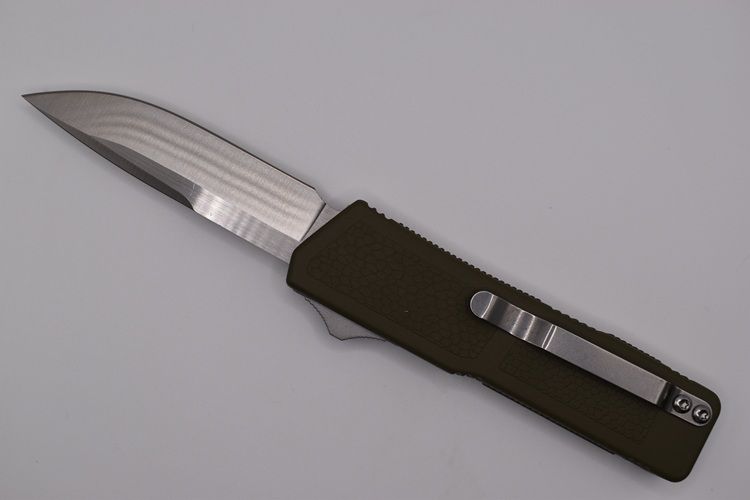Lightning Supreme OD Green D/A OTF Automatic Knife Drop Point Satin Plain. The Army Green Lightning Supreme has an 8 inch total length with a 3.25 inch blade. It is a double action in and out switchblade knife. This is a taiwan version. The taiwan version was the first produced before the chinese versions came out. This version has aircraft aluminum handles and better made metal blades. The springs in these are made better than the chinese versions. It comes with a pocket clip which can be taken off.