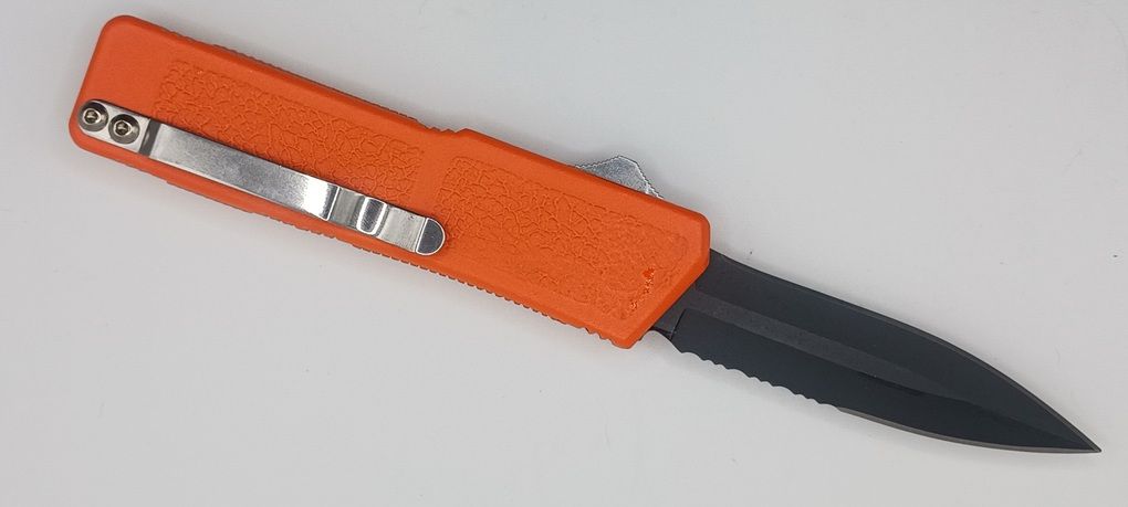 Lightning Supreme Orange D/A OTF Automatic Knife Dagger Point Black Serrated. The Orange Lightning Supreme has an 8 inch total length with a 3.25 inch blade. It is a double action in and out switchblade knife. This is a taiwan version. The taiwan version was the first produced before the chinese versions came out. This version has aircraft aluminum handles and better made metal blades. The springs in these are made better than the chinese versions. It comes with a pocket clip which can be taken off.
