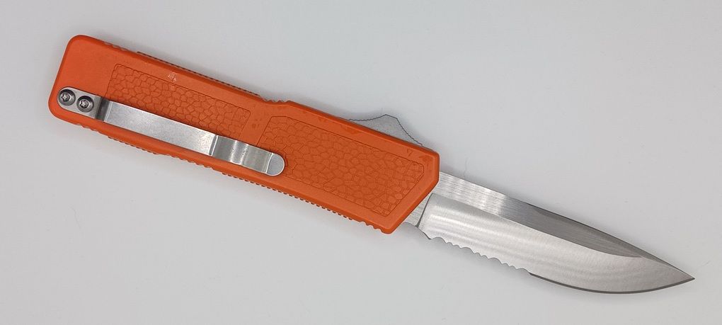 Lightning Supreme Orange D/A OTF Automatic Knife Drop Point Satin Serrated. The Orange Lightning Supreme has an 8 inch total length with a 3.25 inch blade. It is a double action in and out switchblade knife. This is a taiwan version. The taiwan version was the first produced before the chinese versions came out. This version has aircraft aluminum handles and better made metal blades. The springs in these are made better than the chinese versions. It comes with a pocket clip which can be taken off.