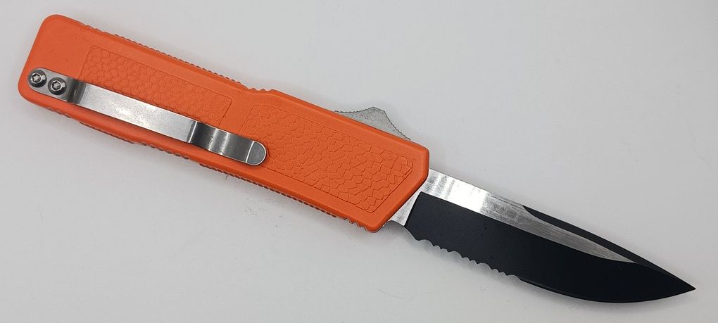 Lightning Supreme Orange D/A OTF Automatic Knife Drop Point Two Tone Serrated. The Orange Lightning Supreme has an 8 inch total length with a 3.25 inch blade. It is a double action in and out switchblade knife. This is a taiwan version. The taiwan version was the first produced before the chinese versions came out. This version has aircraft aluminum handles and better made metal blades. The springs in these are made better than the chinese versions. It comes with a pocket clip which can be taken off.