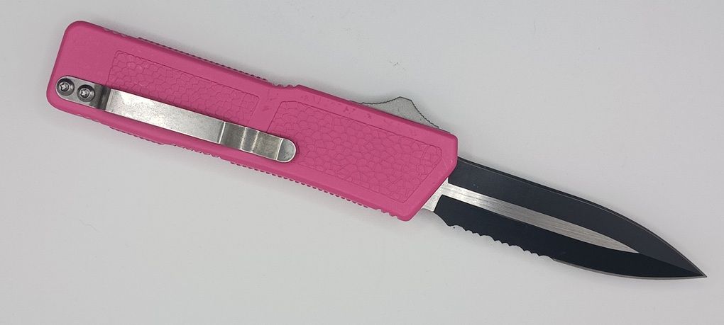 Lightning Supreme Pink D/A OTF Automatic Knife Dagger Point Two Tone Serrated. The Pink Lightning Supreme has an 8 inch total length with a 3.25 inch blade. It is a double action in and out switchblade knife. This is a taiwan version. The taiwan version was the first produced before the chinese versions came out. This version has aircraft aluminum handles and better made metal blades. The springs in these are made better than the chinese versions. It comes with a pocket clip which can be taken off.