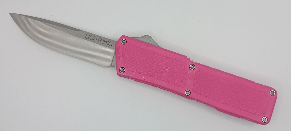 Lightning Supreme Pink D/A OTF Automatic Knife Drop Point Satin Plain. The Pink Lightning Supreme has an 8 inch total length with a 3.25 inch blade. It is a double action in and out switchblade knife. This is a taiwan version. The taiwan version was the first produced before the chinese versions came out. This version has aircraft aluminum handles and better made metal blades. The springs in these are made better than the chinese versions. It comes with a pocket clip which can be taken off.