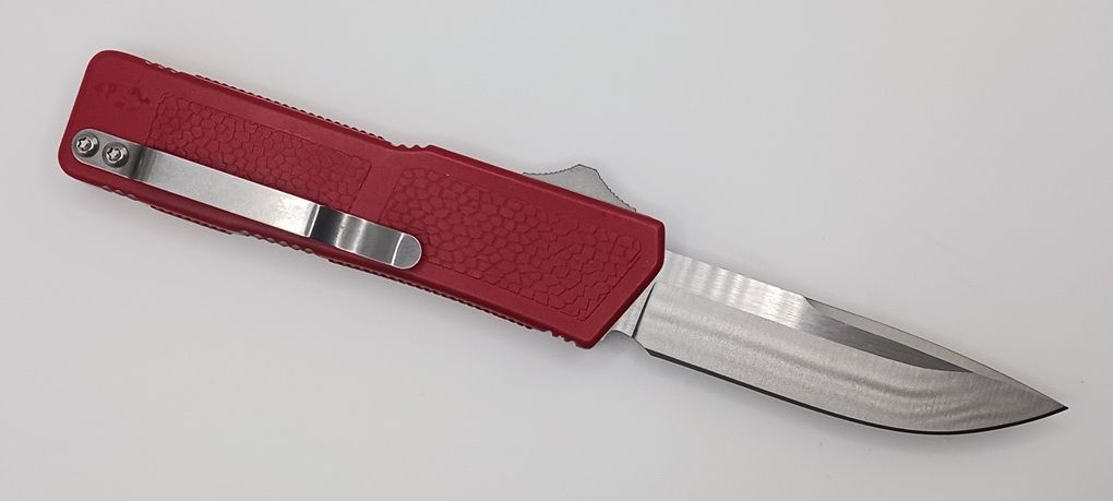 Lightning Supreme Red D/A OTF Automatic Knife Drop Point Satin Plain. The Red Lightning Supreme has an 8 inch total length with a 3.25 inch blade. It is a double action in and out switchblade knife. This is a taiwan version. The taiwan version was the first produced before the chinese versions came out. This version has aircraft aluminum handles and better made metal blades. The springs in these are made better than the chinese versions. It comes with a pocket clip which can be taken off.