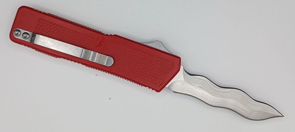 Lightning Supreme Red D/A OTF Automatic Knife Kris Point Satin Plain. The Red Lightning Supreme has an 8 inch total length with a 3.25 inch blade. It is a double action in and out switchblade knife. This is a taiwan version. The taiwan version was the first produced before the chinese versions came out. This version has aircraft aluminum handles and better made metal blades. The springs in these are made better than the chinese versions. It comes with a pocket clip which can be taken off.