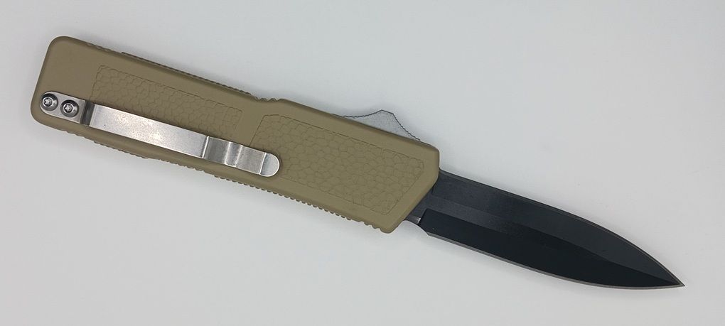 Lightning Supreme Tan D/A OTF Automatic Knife Dagger Point Black Plain. The Tan Lightning Supreme has an 8 inch total length with a 3.25 inch blade. It is a double action in and out switchblade knife. This is a taiwan version. The taiwan version was the first produced before the chinese versions came out. This version has aircraft aluminum handles and better made metal blades. The springs in these are made better than the chinese versions. It comes with a pocket clip which can be taken off.