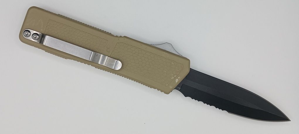 Lightning Supreme Tan D/A OTF Automatic Knife Dagger Point Black Serrated. The Tan Lightning Supreme has an 8 inch total length with a 3.25 inch blade. It is a double action in and out switchblade knife. This is a taiwan version. The taiwan version was the first produced before the chinese versions came out. This version has aircraft aluminum handles and better made metal blades. The springs in these are made better than the chinese versions. It comes with a pocket clip which can be taken off.