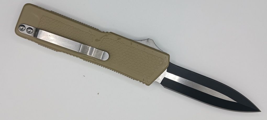 Lightning Supreme Tan D/A OTF Automatic Knife Dagger Point Two Tone Plain. The Tan Lightning Supreme has an 8 inch total length with a 3.25 inch blade. It is a double action in and out switchblade knife. This is a taiwan version. The taiwan version was the first produced before the chinese versions came out. This version has aircraft aluminum handles and better made metal blades. The springs in these are made better than the chinese versions. It comes with a pocket clip which can be taken off.