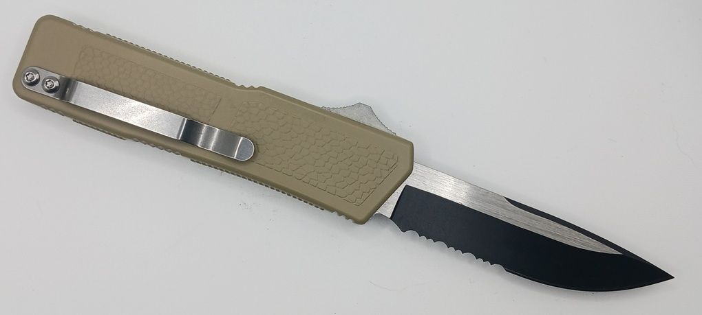 Lightning Supreme Tan D/A OTF Automatic Knife Drop Point Two Tone Serrated. The Tan Lightning Supreme has an 8 inch total length with a 3.25 inch blade. It is a double action in and out switchblade knife. This is a taiwan version. The taiwan version was the first produced before the chinese versions came out. This version has aircraft aluminum handles and better made metal blades. The springs in these are made better than the chinese versions. It comes with a pocket clip which can be taken off.