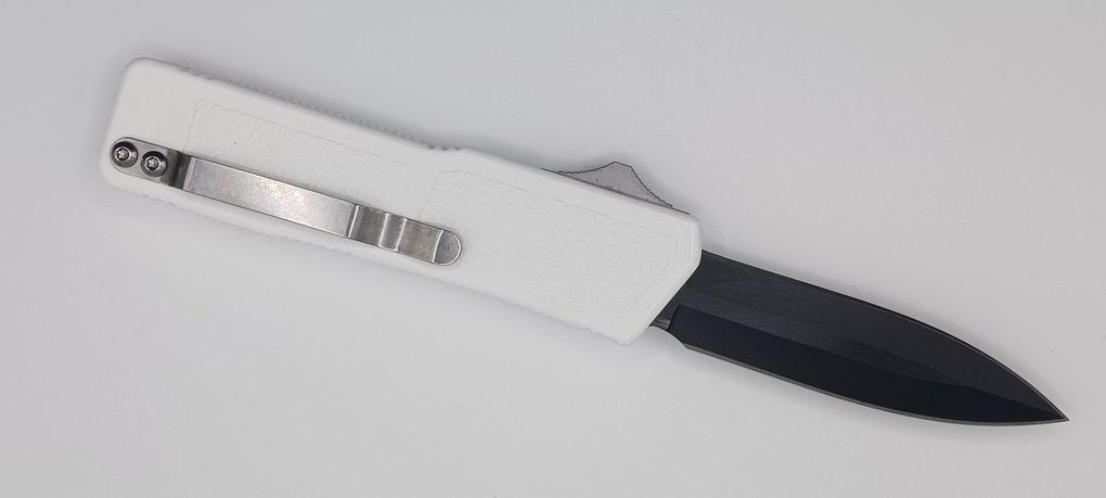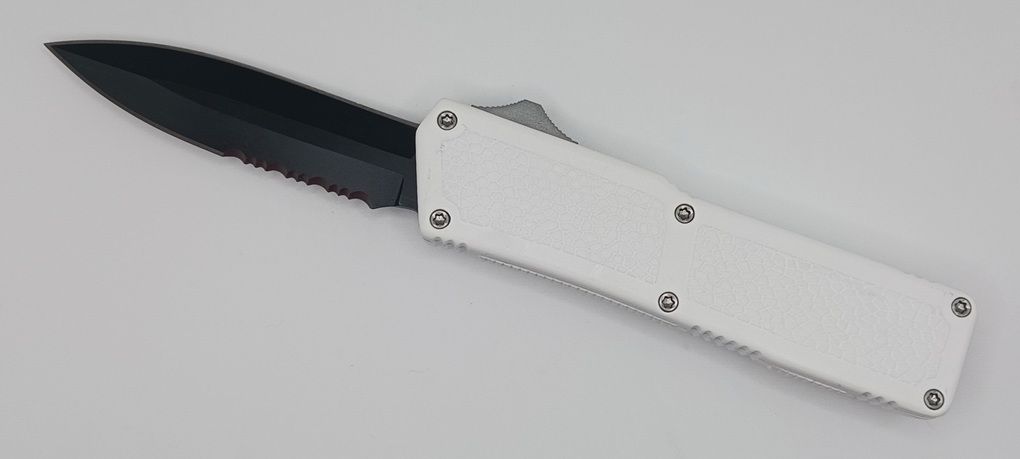 Lightning Supreme White D/A OTF Automatic Knife Dagger Point Black Serrated. The White Lightning Supreme has an 8 inch total length with a 3.25 inch blade. It is a double action in and out switchblade knife. This is a taiwan version. The taiwan version was the first produced before the chinese versions came out. This version has aircraft aluminum handles and better made metal blades. The springs in these are made better than the chinese versions. It comes with a pocket clip which can be taken off.
