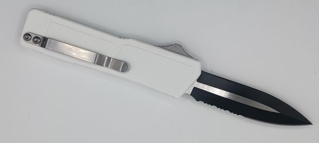 Lightning Supreme White D/A OTF Automatic Knife Dagger Point Two Tone Serrated. The White Lightning Supreme has an 8 inch total length with a 3.25 inch blade. It is a double action in and out switchblade knife. This is a taiwan version. The taiwan version was the first produced before the chinese versions came out. This version has aircraft aluminum handles and better made metal blades. The springs in these are made better than the chinese versions. It comes with a pocket clip which can be taken off.