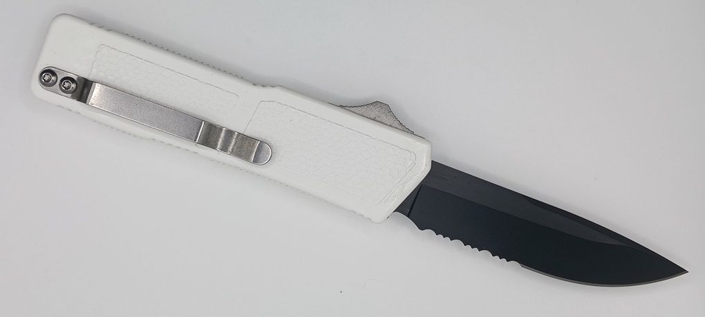 Lightning Supreme White D/A OTF Automatic Knife Drop Point Black Serrated. The Green Lightning Supreme has an 8 inch total length with a 3.25 inch blade. It is a double action in and out switchblade knife. This is a taiwan version. The taiwan version was the first produced before the chinese versions came out. This version has aircraft aluminum handles and better made metal blades. The springs in these are made better than the chinese versions. It comes with a pocket clip which can be taken off.