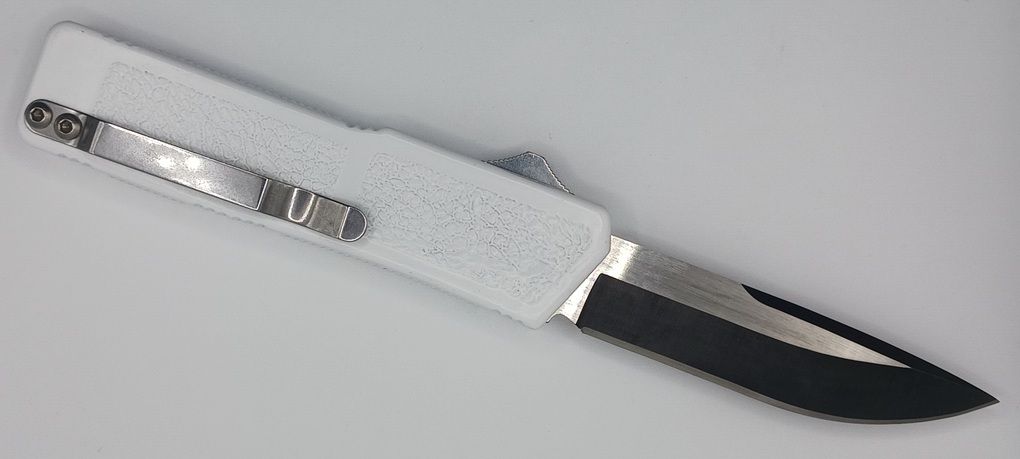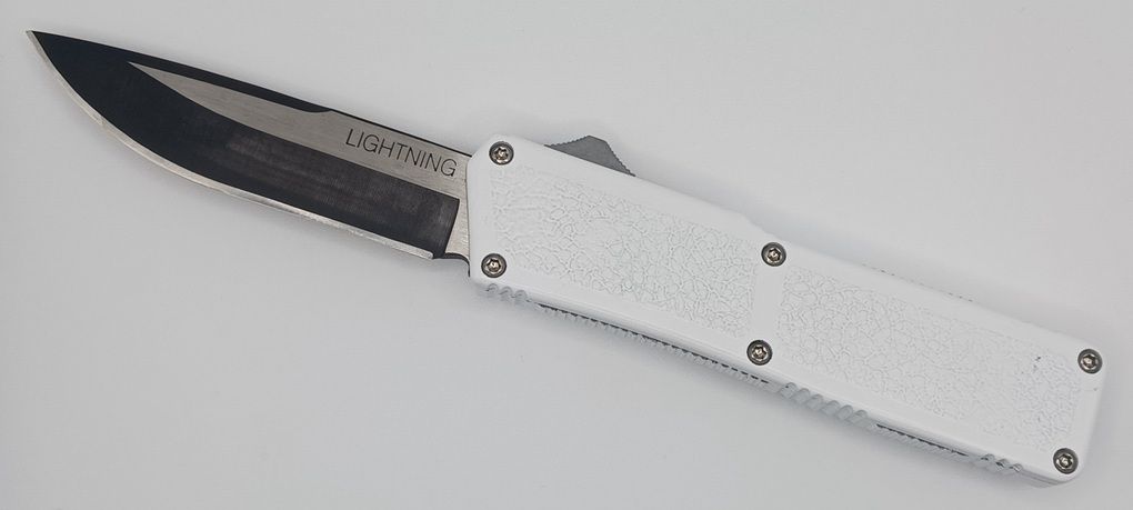 Lightning Supreme White D/A OTF Automatic Knife Drop Point Two Tone Plain. The White Lightning Supreme has an 8 inch total length with a 3.25 inch blade. It is a double action in and out switchblade knife. This is a taiwan version. The taiwan version was the first produced before the chinese versions came out. This version has aircraft aluminum handles and better made metal blades. The springs in these are made better than the chinese versions. It comes with a pocket clip which can be taken off.