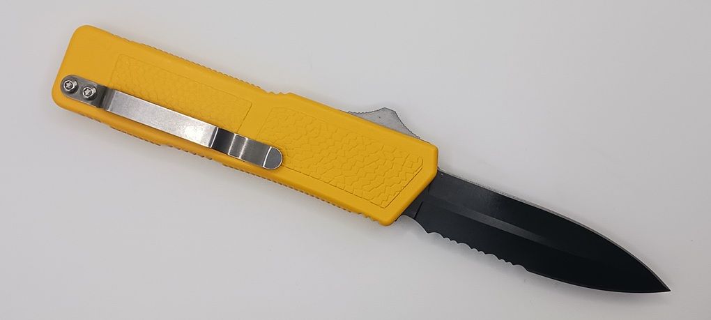 Lightning Supreme Yellow D/A OTF Automatic Knife Dagger Point Black Serrated. The Yellow Lightning Supreme has an 8 inch total length with a 3.25 inch blade. It is a double action in and out switchblade knife. This is a taiwan version. The taiwan version was the first produced before the chinese versions came out. This version has aircraft aluminum handles and better made metal blades. The springs in these are made better than the chinese versions. It comes with a pocket clip which can be taken off.
