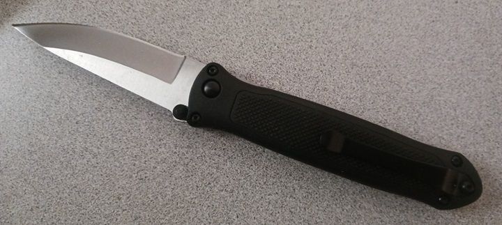 Linder Dual Action Automatic Hidden Release Knife. This double action hidden release knife is made by linder. It has a 440 rostfrei 3.25 Inch blade 7.75 inches overall length. Made in germany. It has a polymer handle with a rubber insert over the activation button. This knife can be opened like a regular manual knife or automaticaly with the push of the hidden button. Comes with a leather belt sheath.