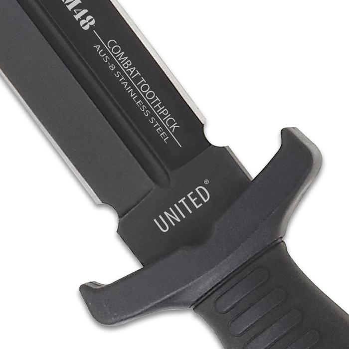 For fast, reliable protection whenever you need it, you can count on this discreet toothpick knife to back you up It has a keenly sharp, 5" AUS-8 stainless steel blade with a non-reflective, black coating and a penetrating point The knife has an injection molded TPR handle, which is ridged for a secure, no-slip grip, and a brass lanyard hole It is 9 1/4" in overall length and fits securely in a sturdy, nylon sheath with shoulder harness for easy, covert carry