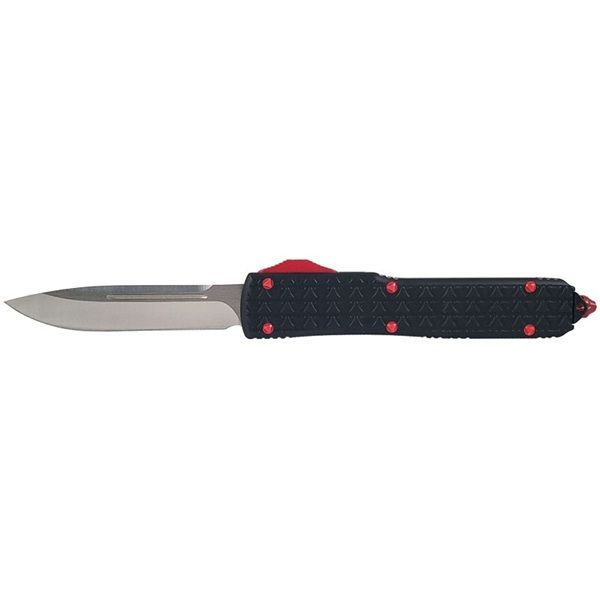 Mega Tarantula Black Red D/A OTF Automatic Knife (3.5" Drop Point). This OTF knife's handle and blade are precisely CNC machined for a very well put together knife. When you press the switch forward, the AUS-8 steel blade propels out with authority. After you release the blade, you'll find that the AUS-8 steel blade has a razor sharp edge and higher strength, hardness, and wear resistance than comparably priced knives. The handle features a triangle-shaped Gripster handle the provides an excellent grip. If you are looking for a really cool knife, then take a look at this new machine shop made knife that is amazing people everywhere. First you notice the light weight. Because this one has the handle machined of aircraft allow then hard anodized. Next, the action is buttery smooth. Finally, look at the fine blade steel, carefully machined to perfection. Knife feels like $285 and you won’t want to put it down. For the money, you won't find a better value! Blade: 3.5" Overall: 8.875" Closed: 5.25" Weight: 3.6 oz.