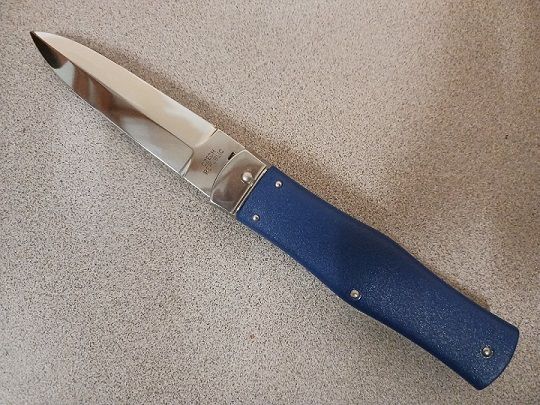 Mikov 241 Predator Leverlock Automatic Knife Blue No Clip. This knife has a very smooth action and nice weight when opening. This is for sure something you want in your collection of automatic knives. These are very well made and hard to come by. It is 8.5 inches overall length 3.75 inch dagger blade. No clip on the handle and comes with a leather belt sheath