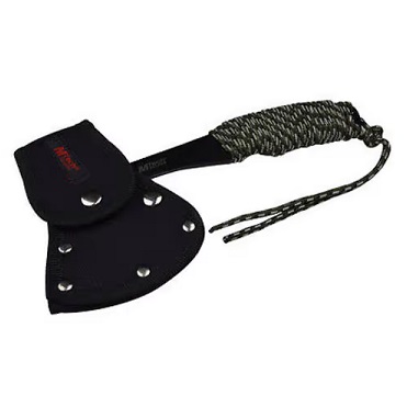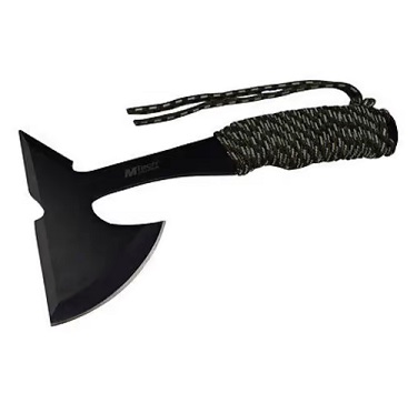 MTech USA 9" Throwing Axe Black Hatchet Full Tang. This outdoor survival axe is perfect for everyday chopping or throwing purposes. With a 9" overall height, this axe provides an amazing center of gravity and balance during each and every swing. The black blade measures at 3mm thick with dimensions of 4.75" X 2.5". Don't let this smaller size discourage you because the handle is wrapped in a sturdy cord for optimal grip when in use. This product also comes with extra cord for use as a lanyard and a protective nylon sheath.