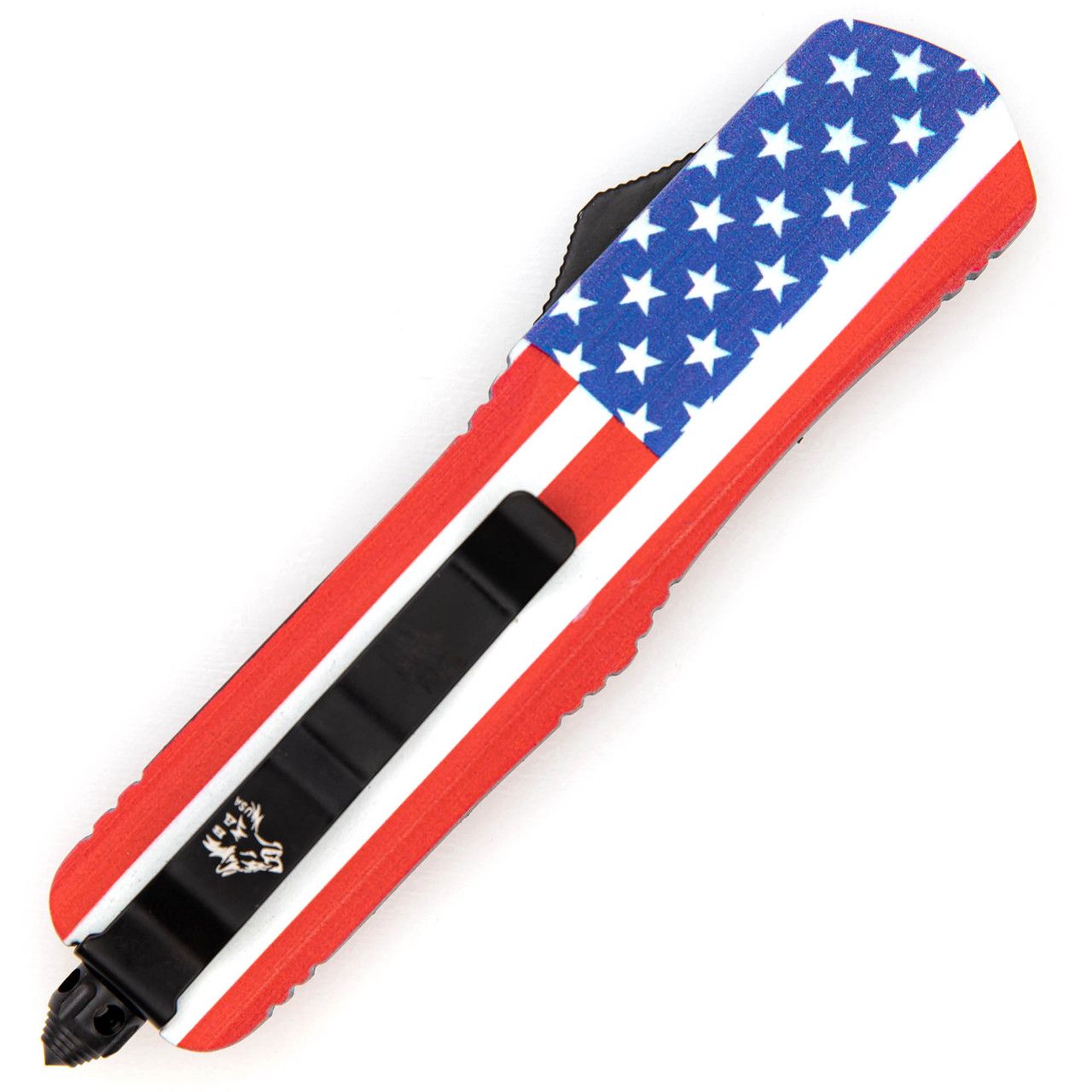 My Roots Heavy Duty Automatic Dual Action Out The Front Knife 2608. No matter where you go, your love for your country will always be recognized when you carry around this badass heavy duty OTF knife. This automatic knife is made with a hefty handle casing for larger hands. My Roots OTF Knife is an out the front knife with the American flag proudly adorned on the handle. An OTF is a knife characterized by the blade being completely concealed within the handle while retracted. When deployed, the blade springs out of the tip (or front) of the handle. This style of automatic knife is popular due to the safety of the blade being completely concealed within the handle when not in use. The American tanto-style blade is constructed of stainless steel and features a two-tone black and silver finish. Included with your purchase is a black nylon sheath that you can attach to your belt for easy carry. Overall Length: 9.5 Inches, Blade Length: 3.75 Inches