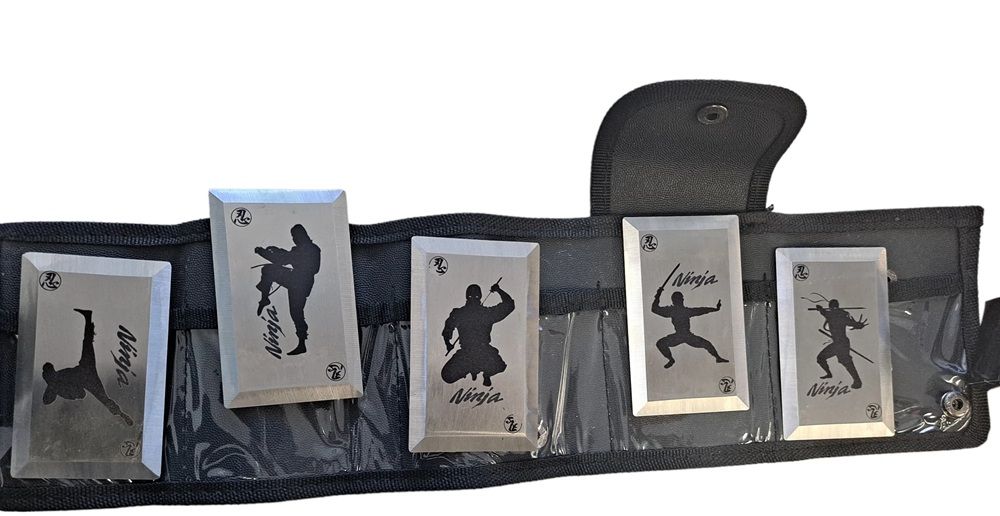 TIGER USA Throwing cards-- not stars! NINJA 5 piece set Razor-sharp Beautifully made Includes free nylon case Product Description These are a Tiger USA : throwing cards-- not stars, cards. Get your hands on these hot selling beauties before supplies run out. If the legality of throwing stars is kind of questionable-- why not consider some cards. Our beautifully made and designed throwing cards are razor-sharp and stick into any target or bulls-eye you aim at. Get yours today. Something this good isn't around forever.