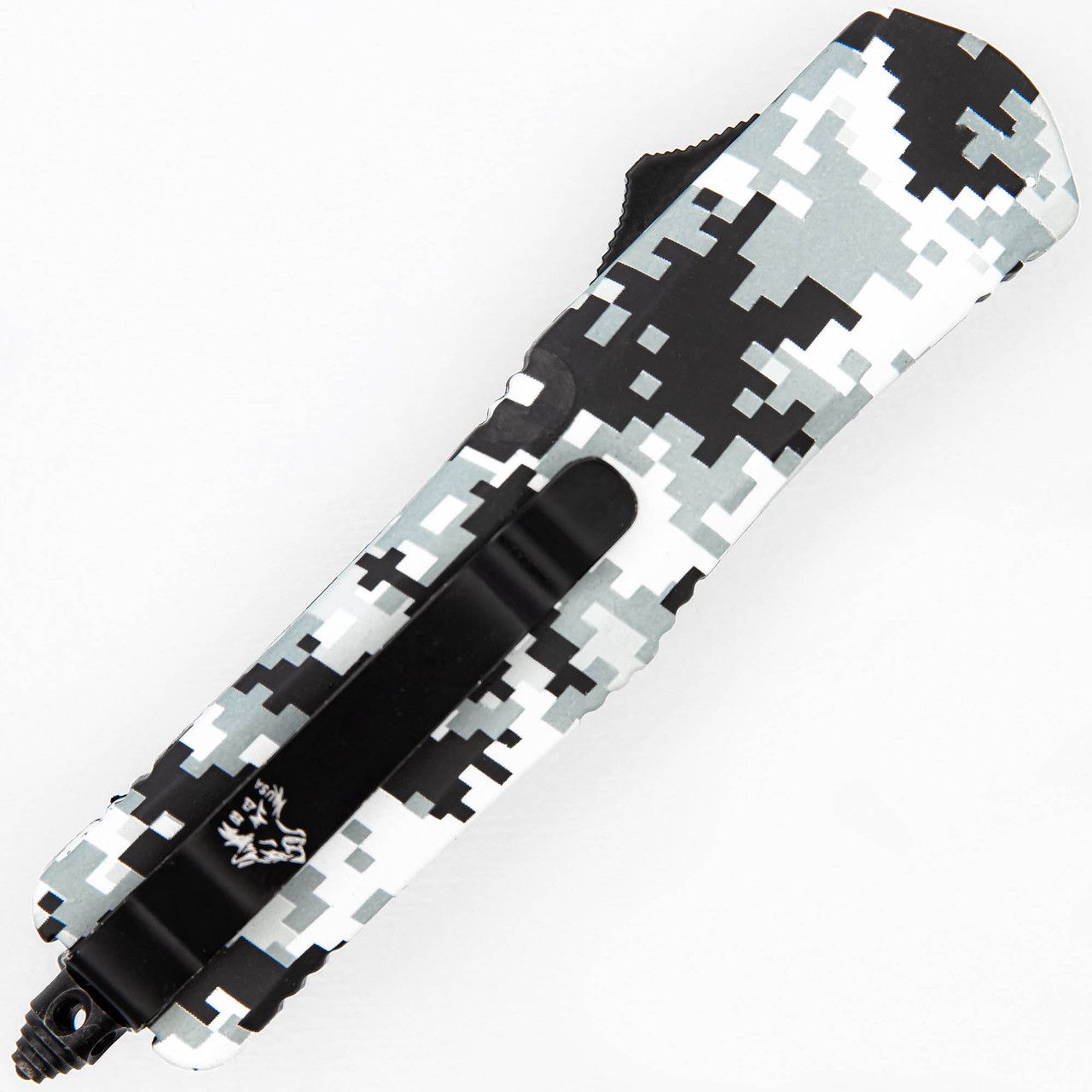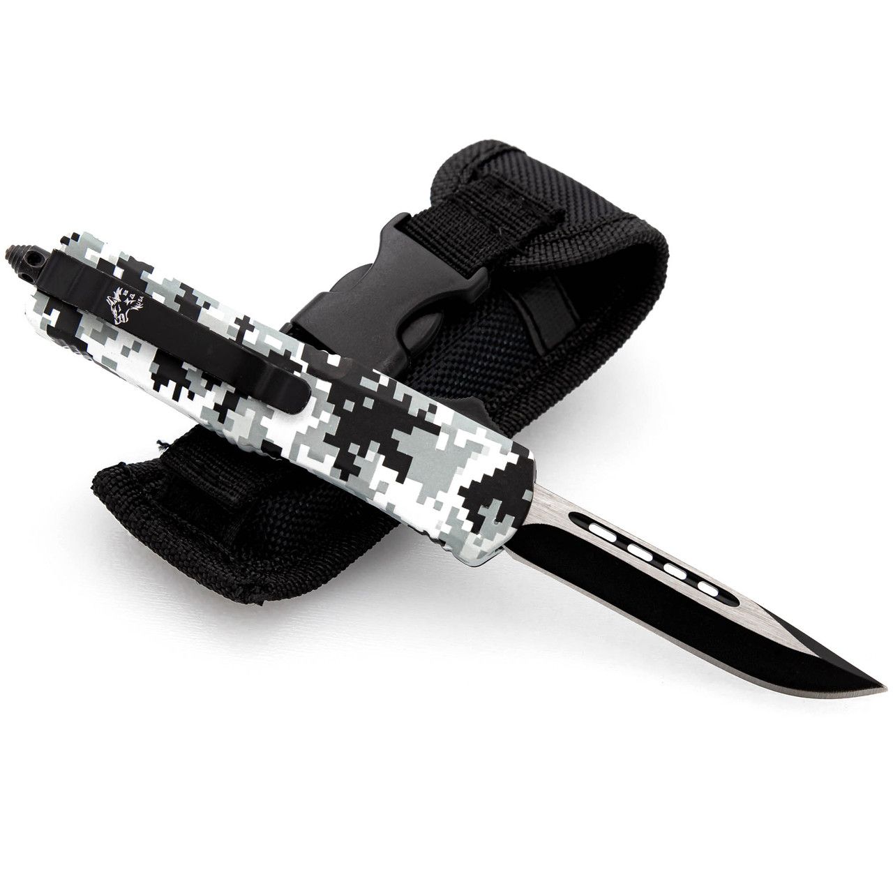 This automatic out the front knife is great because it is dual-action, meaning you can eject and retract your blade with only the push of a button. The stainless-steel blade is made into a drop point style and comes in a two-toned finish. The handle casing is made from a durable zinc aluminum alloy and comes with a digital winter camo design. There is slight ridging along the sides of the handle for better grip, especially in wet conditions. This dual-action automatic knife also comes equipped with a sleek black pocket clip and glass breaker in case of emergencies. Included with your knife is a nylon sheath with snap closure and belt loop so you can conveniently carry it anywhere. Overall Length: 7.3 Inches, Blade Length: 2.8 Inches