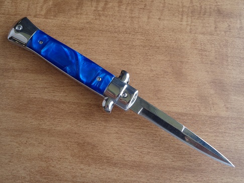 Old School 9" Blue Pearl Stiletto D/A OTF Automatic Knife Satin Bayo. Overall Length:9.00" Blade Length:3.75" Stainless Steel Satin Bayonet. Comes with a belt sheath. Dual action in and out with the push of a button. Very strong spring action and construction without any misfires. Marked Made In Italy on the blade