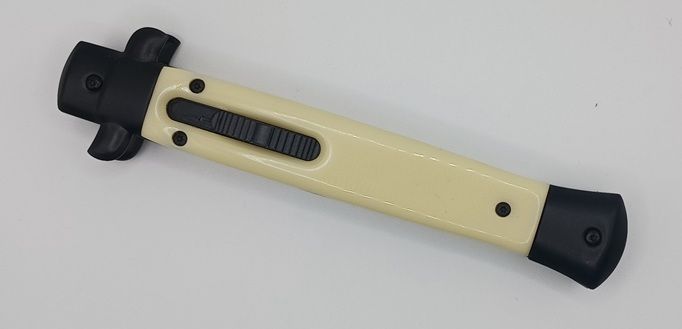 Old School Mago 11" Imitation Ivory Stiletto D/A OTF Automatic Knife Satin Dagger. This classic style, stiletto blade knife features an old world feel that is reminiscent of the widely popular and very recognizable godfather stiletto automatic knives. But this version has an out the front blade that smoothly flies out the front of the handle with a flick of the switch. Blade: 4.75" Overall: 11" Closed: 6.125" Weight: 8.4 oz. Stamped Made In Italy on the blade