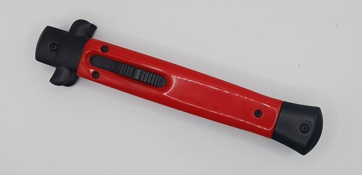 Old School Mago 11" Red Stiletto D/A OTF Automatic Knife Satin Dagger. This classic style, stiletto blade knife features an old world feel that is reminiscent of the widely popular and very recognizable godfather stiletto automatic knives. But this version has an out the front blade that smoothly flies out the front of the handle with a flick of the switch. Blade: 4.75" Overall: 11" Closed: 6.125" Weight: 8.4 oz. Stamped Made In Italy on the blade