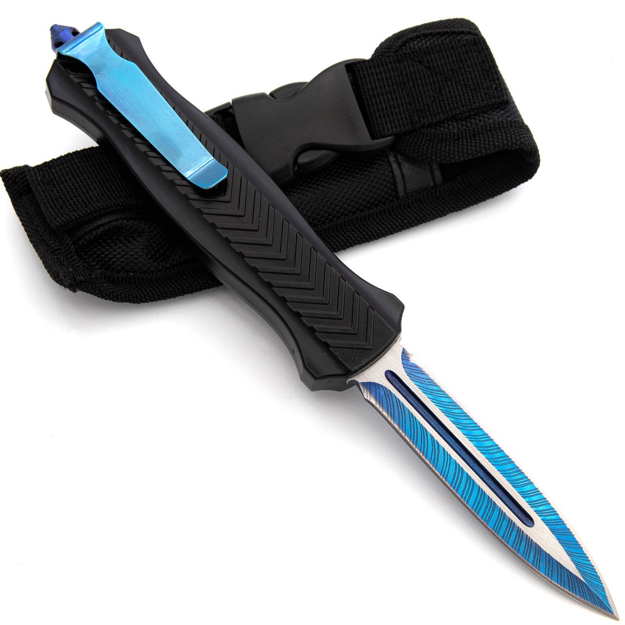 On the Rise Automatic OTF Black Out the Front Knife Blue Dagger. You’ll have ups and downs just like the waves. What they don’t tell you is that sometimes the highs can mimic tidal waves and the lows can cut into the ground like earthquakes. I hope you’re breaking the clouds right now. The On the Rise Automatic OTF is an automatic out the front knife with a gorgeous blue blade, hardware, and belt clip. The stainless-steel blade is textured as if the blue is erupting from the blade itself like a tall wave. Contrasting the blue is the jet black of the aluminum handle and silver center switch. The center switch is easy to use and the contour of the handle maximizes comfort when holding the knife. The On the Rise OTF comes with a black nylon sheath for easy carry and storage so take a deep breath and brace for the waves. Overall Length (Open): 9.5 Inches. Weight: 0.6 lbs.
