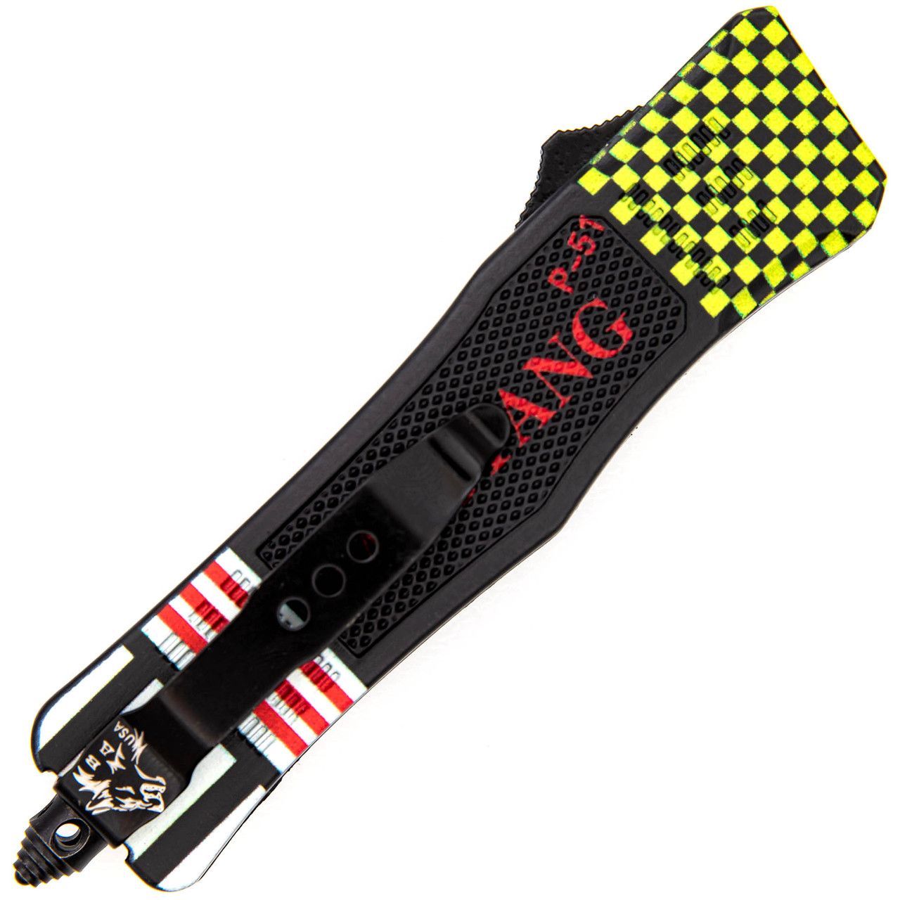 Peter Dash Flash Automatic Dual Action Compact OTF Knife 2695. The stainless-steel blade is formed into a spear point style with a black and silver finish. Not only is this knife beautiful, but it is also extremely fast and efficient. The trigger on the side of the handle can be used to deploy the blade almost instantly. Use the same trigger to retract the blade back into the handle just as fast. The handle itself is constructed of zinc alloy, adorned with a design that pays tribute to the North American P-51 Mustangs used during WWII and the Korean War. A sleek black pocket clip is mounted on the handle, as well as an emergency glass breaker. Included with your purchase is a free black quick release sheath complete with belt loop. Overall Length: 7 Inches, Blade Length: 2.75 Inches