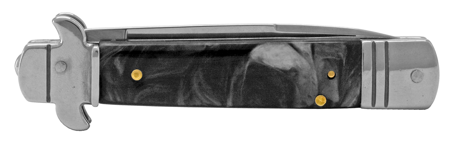 Pocket Pal Imitation Dark Horn Lever Lock Automatic Knife. Blade Material 440 Stainless Steel Blade Type Razor Folding Action automatic Handle Construction Stainless Steel and Faux Pearl Features Flipdown Release Auto Blade Length 3.38" Handle Length 4.25" Overall Length 7.63"