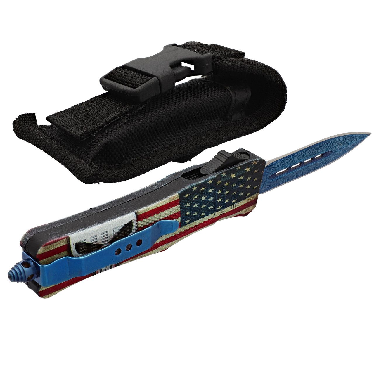 Punisher USA Flag D/A OTF Automatic Knife Blue Damascus Dagger. The Punisher OTF is an automatic out the front knife with an American flag and skull handle design. The blade is stunning blue Damascus with a silver edge. Four cutouts are placed in the center of the blade to lower and disperse weight for easier and more precise use. The switch is on the side of the handle and textured so it is easy to deploy the blade with one hand. The No Warning OTF is equipped with both a belt clip and a glass breaker at the base of the handle. Included with this knife is a nylon sheath equipped with a belt loop for easy carry and safe storage. Overall Length: 7 Inches. Weight: 0.4 lbs.