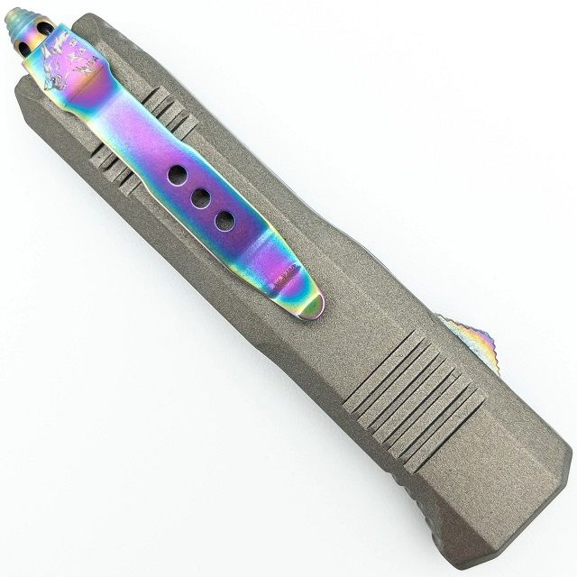 Ranger 6.75" D/A OTF Silver Automatic Knife Damascus Titanium Serrated Dagger. Silver zinc alloy handle. It has a dual action mechanism, titanium switch on the side. The blade is made of stainless steel in a two-tone titanium damascus finish. The blade is formed in a spear point style, and is also partially serrated on both sides of the blade. A glass breaker located on the bottom of the handle. Comes with a nylon carrying pouch 1095/15N20 steel Overall Length: 6.75 inches Blade Length: 2.75 inches Handle Length (Glass breaker Included): 4 inches