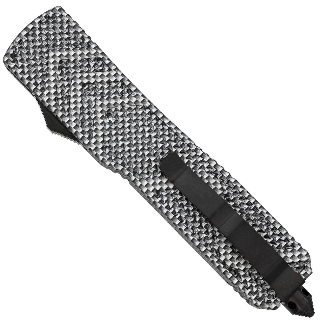Red on Steel Automatic OTF Out the Front Knife Dagger. The handle has multiple shades of gray with an ombre checkered finish. Raised texturing on both sides of the handle provide non-slip features while adding to the design and feel of the knife in your hand. The blade is a bold, stunning red with silver highlights. Four cutouts adorn the center of the blade to balance and distribute weight for more precise handling. The switch to deploy the blade is located on the side of the handle and is textured itself for easier use. Included with the Red on Steel OTF is a nylon sheath equipped with a belt loop for safe storage and easy carry. Overall Length: 9.5 Inches. Weight: 0.8 lbs.