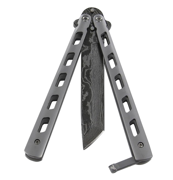 The tanto blade is made from Damascus steel that consists of 1095/15N20 Alloy Steel. The HRC is around 54 to 55 with 176 true blade layers. The twist pattern is just impeccable. Both the bite and safe handles are also made from stainless steel with geometric weight reducing cutouts in the handle. This makes them lighter and perfect for flipping. This knife features a double tang pins meant to hold the blade away from the handle when closed to prevent dulling and a second pin to keep the handles from excessively banging together while the butterfly knife is being manipulated. Included is a safety latch to keep your handle s locked up tight. Overall Length: 8.75 Inches.