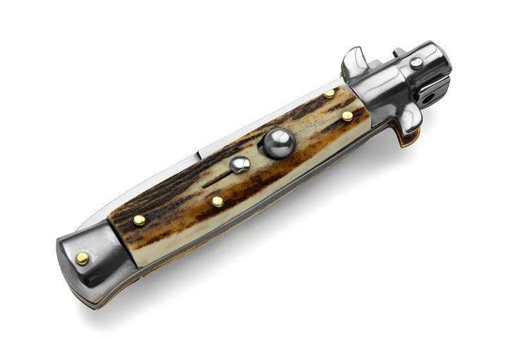 SKM Stag Horn Picklock 7" Italian Stiletto Automatic Knife Satin Bayonet. Beautiful little automatic knife made in Maniago. An experienced craftsman created this switchblade with a picklock mechanism. Steel bolsters , button and safety. Price/quality is good on this collectable knife. MANIAGO-ITALY tang stamp. Add this to your collection. Note: as it is a natural material, color, texture and pattern will vary from knife to knife. Limited quantity available. Overall Length: 18cm - 7" Blade Length: 8cm - 3.14" Blade thickness: 3mm - 0.1" Weight: 80 gr Blade material: 440A Stainless steel Handle material: Stag Frame material: Stainless steel Made in: Italy
