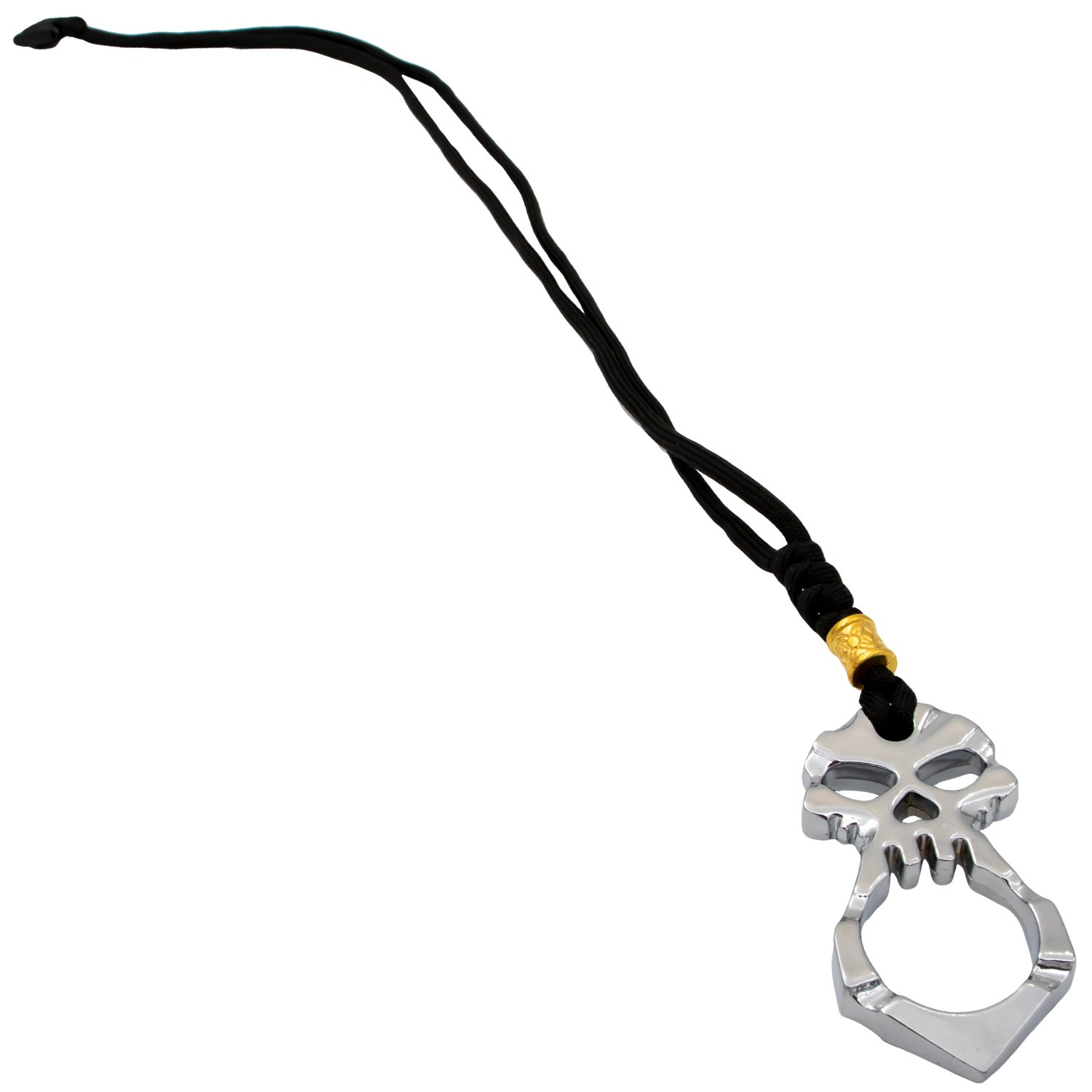 Skull Knuckle Lanyard Necklace One Finger Silver Large. Weighs in at 3.10 ounces Skull has a length of 2.95 inches Includes 15 inch paracord lanyard with a steel, decorated encasing Detailed skull shape and look Unique keychain and self defense tool