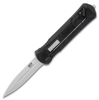 The Bead Blasted Pocket Knife from Smith & Wesson is an assisted opening OTF that was built with tactical intent in mind The 3 1/2”, AUS-8 stainless steel blade is forged into a double-edged spear point, and it has a bead-blasted finish The aluminum handles are contoured for a better grip and include a glass breaker pommel, a pocket clip, and a safety lock The OTF pocket knife has a safety and a tab on the side used to retract the blade, in addition to, the thumb slide