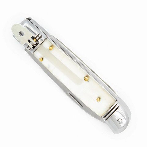 Stainless Automatic Lever Lock Knife Pearl White. Faux Pearl ABS grips, comes with its own black nylon sheath with a belt loop. Overall Length: 8 inches (Open), 4.5 inches (Closed). Weight: 0.4 lbs
