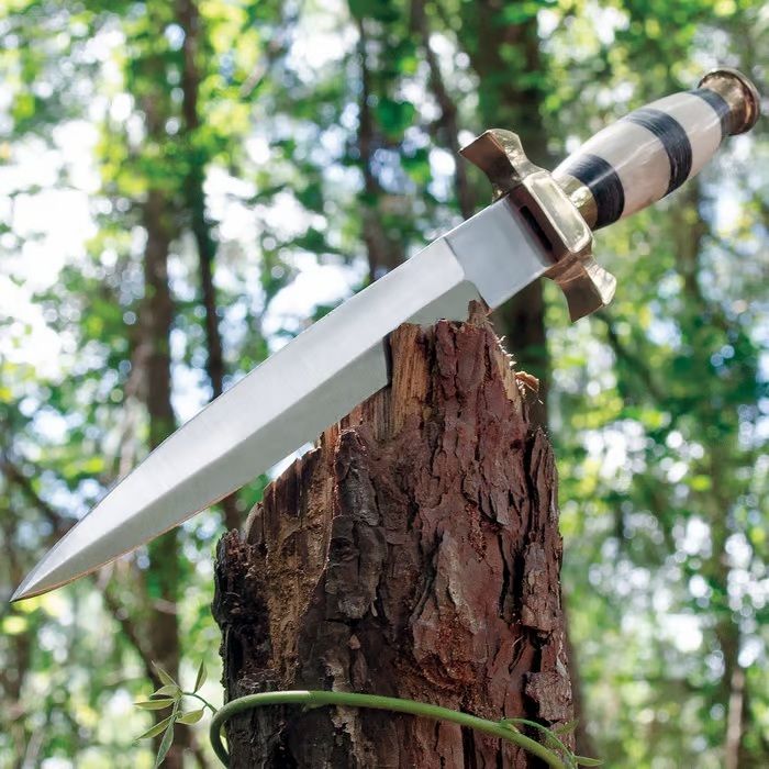 Our classically designed Striped Bone Herdsman's Hunting Dagger features a double-edged stainless steel blade with a piercing point. The handle is carefully and handsomely crafted of genuine bone, accented by a gleaming brass guard and decorative pommel. Includes custom leather sheath. Double-edged stainless steel blade Genuine bone handle Brass guard & pommel Custom leather sheath 13-3/8" overall length