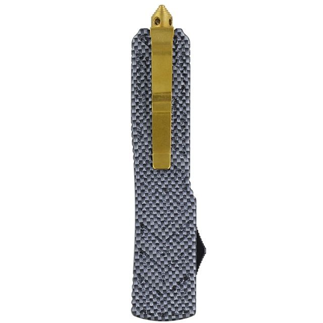 Tarantula Carbon Fiber D/A OTF Automatic Knife Etched Gold Tanto Blade. Specifications: Blade material: Stainless steel Handle material: Silver carbon fiber Blade Style: Tanto Blade finish: Gold Handle finish: Textured Includes: Black nylon pouch, pocket clip, screws Size: Large Mechanism: Automatic out-the-front (OTF) Features: Etched design Textured silver carbon fiber handle for secure grip Non-slip grip on both sides of handle