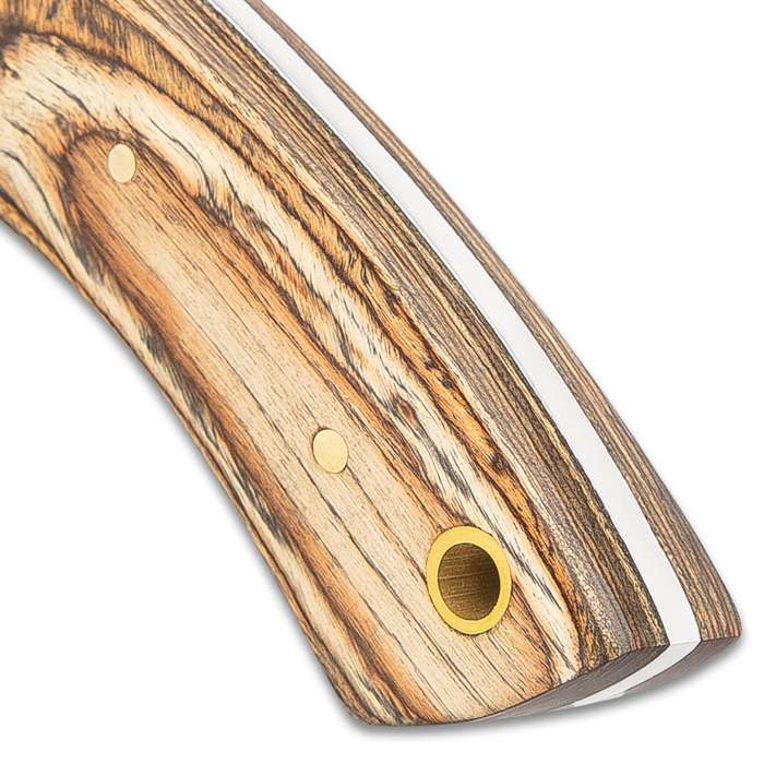 Timber Rattler Tumbleweed Skinner Knife 9.75 Inch. When you need an everyday carry that's up to any task, this skinner from Timber Rattler is just what you're looking for It has a full-tang, 4 1/2" stainless steel blade that's razor-sharp, extending from a brass-plated modified guard The classic wooden handle scales are secured to the tang with brass-plated pins and there is a lanyard hole The compact fixed blade knife is 9 3/4" overall and it can be carried in its genuine leather belt sheath