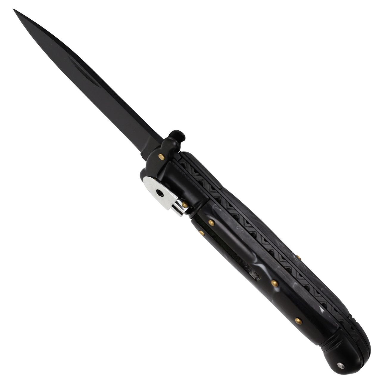Touch of Destiny All Black Marble Swinguard Automatic Lever Lock Stiletto Knife. The knives are lever lock however they have a feature unique from other lever locks: a stiletto-like bolster that springs up and into place horizontally when the blade is deployed and retracts to natural position as the blade is retracted. The bottom bolster is angled toward the blade which provides stable grip. Each knife comes with its own black nylon sheath for safe storage and convenient carry. Overall Length: 8.12 Inches (Open). Weight: 0.3 lbs.