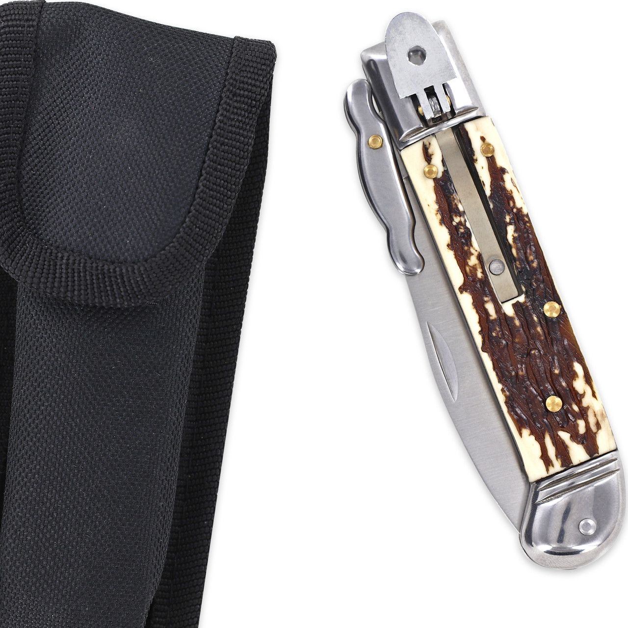 Touch of Destiny Stag Horn Swinguard Automatic Lever Lock Stiletto Knife. The knives are lever lock however they have a feature unique from other lever locks: a stiletto-like bolster that springs up and into place horizontally when the blade is deployed and retracts to natural position as the blade is retracted. The bottom bolster is angled toward the blade which provides stable grip. Each knife comes with its own black nylon sheath for safe storage and convenient carry. Overall Length: 8.12 Inches (Open). Weight: 0.3 lbs