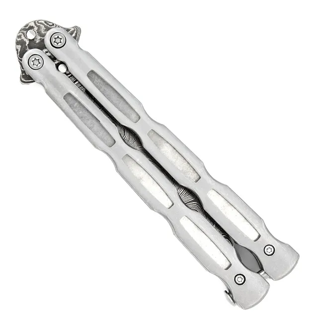 Unchained Damascus Steel Drop Point Heavy Duty Butterfly Knife. Bring eye-catching style and premium craftsmanship to your stock with the Unchained Drop Point Balisong Knife. Designed with a stainless steel drop point blade and a handle forged from Damascus steel, this butterfly knife delivers both performance and appeal. Built tough with heavy-duty materials and a safety latch, it's a reliable piece that will catch the attention of collectors, knife enthusiasts, and balisong trainers. A top-tier product for knife shops and online resellers looking to add value and variety to their offerings. Specifications: Overall Length: 8.875 Inches Blade Length: 4 Inches Blade Material: Stainless Steel (Silver Finish) Blade Style: Drop Point Blade Thickness: 3mm Handle Length: 4.75 Inches Handle Material: Damascus Steel Weight: 1.12 lbs Includes: Safety Latch Features: Stainless Steel Blade – Drop Point Shape for Versatility Damascus Handle – Stylish & Sturdy Heavy Duty for Daily Use Safety Latch for Secure Flipping Ideal for Bulk Orders – Great Resale Potential