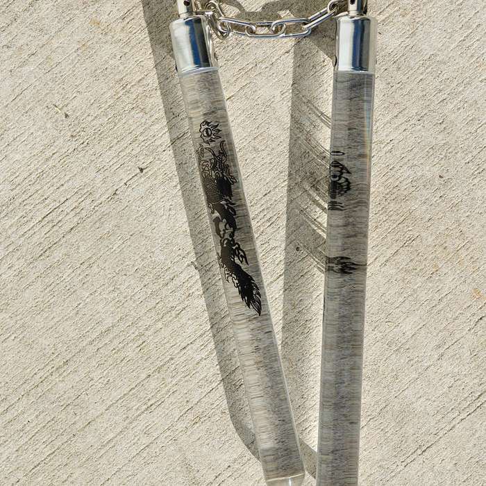 Get the coolest nunchaku on the block with these clear acrylic "chucks" from United Cutlery. Stainless steel caps Steel chain linkage 11 7/8" overall length